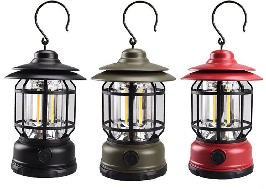 金属製のケージが温かみのある光を演出し、キャンプや庭先での使用に最適です。