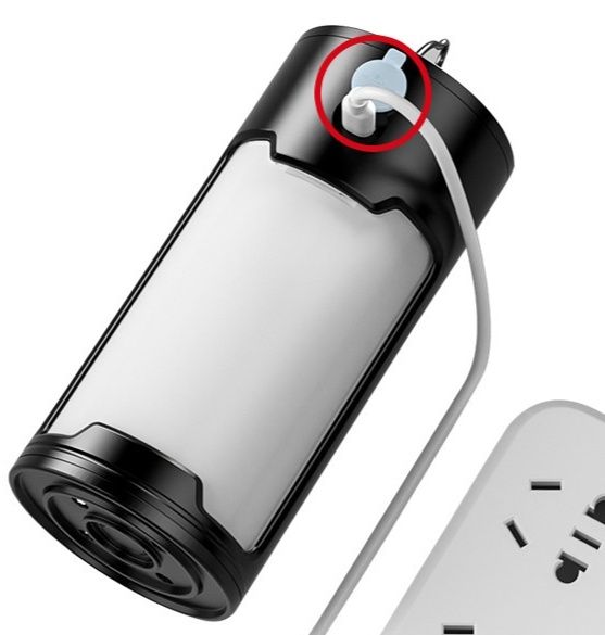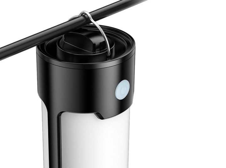 円筒形のスタイリッシュなデザインで、吊り下げハンドル付きなのでテント内や屋外での設置が簡単にできます。